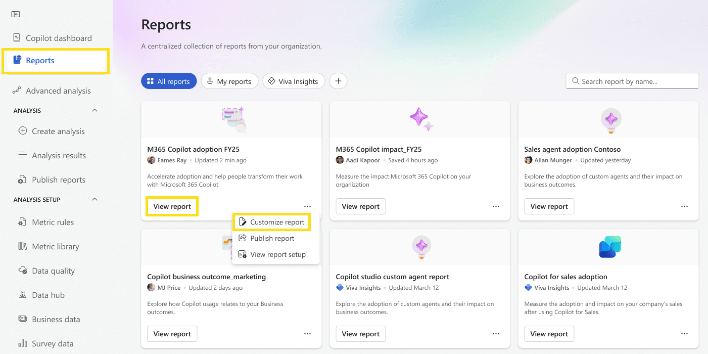 Customize any PowerBI reports in Viva Insights like Copilot adoption, Copilot business impact, Copilot Studio agents report and many more